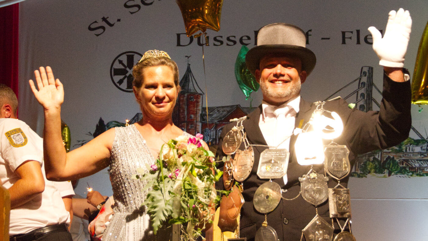 Die Proklamation des neuen Schützenkönigs erfolgt traditionsgemäß am Dienstagabend beim Krönungsball im Festzelt – Alexander Hofer aus der Cäcilien-Kompanie Düsseldorf-Flehe übernimmt mit der feierlichen Ausrufung des Antritts seiner Herrschaft als Schützenkönig von Flehe dieses Amt von Thomas III. Schier von der 1. Hubertus-Jäger-Kompanie.