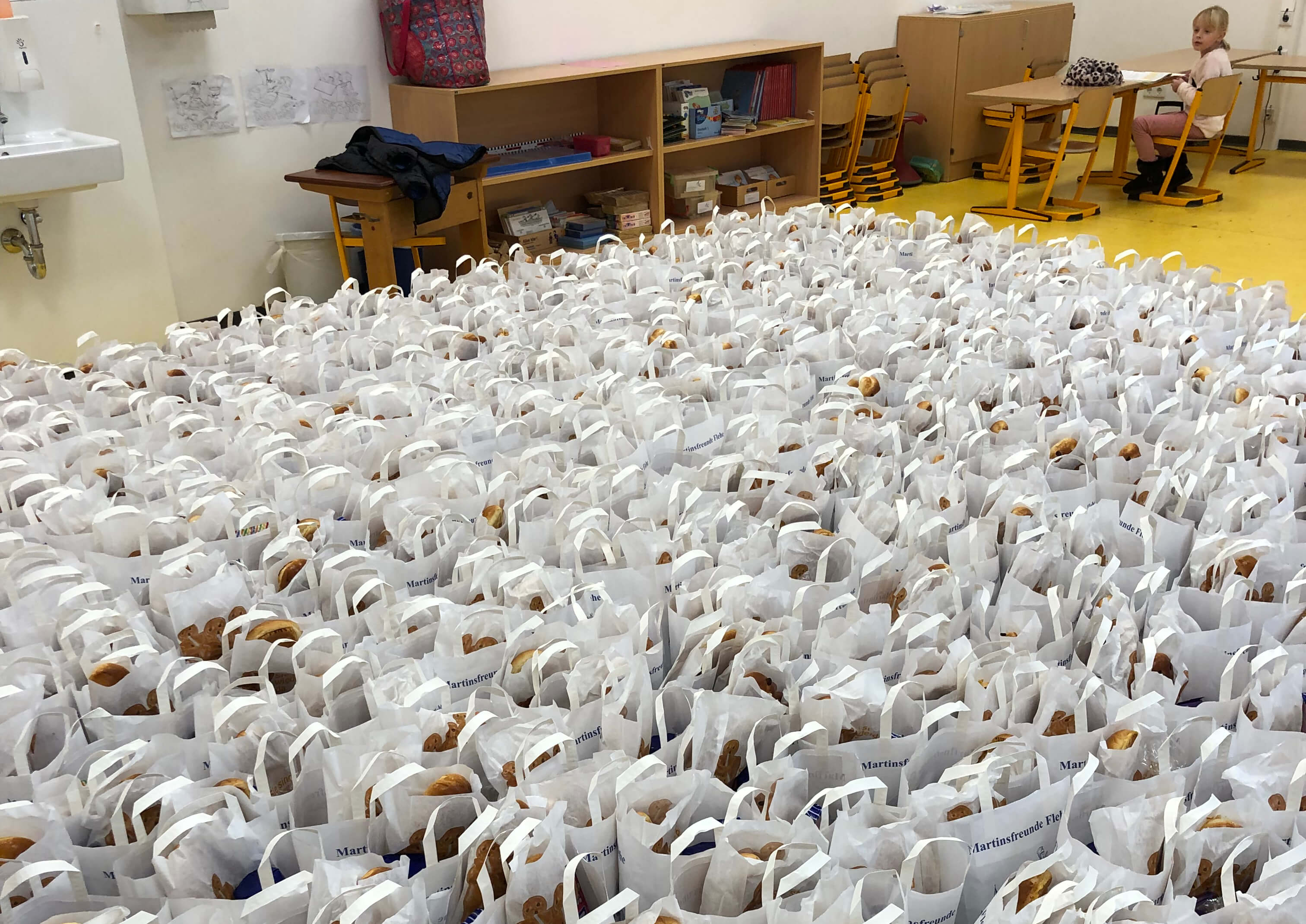 Wie immer soll möglichst jedes Kind am Ende vom Martinsumzug in Düsseldorf-Flehe eine prall gefüllte Martinstüte erhalten. Eine Martinstüte besteht bei uns traditionell aus einem großen Weckmann mit seiner Pfeife, Äpfeln, Mandarinen und diversen Süßigkeiten.